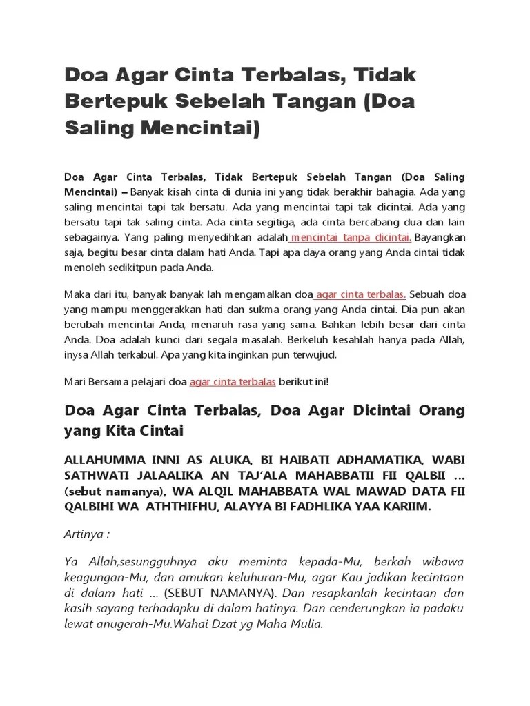 Arti dari doa diatas dalam bahasa indonesia secara lengkap adalah sebagai berikut. "allahumma inni as aluka, bi haibati adhamatika, wabi sathwati jalaalika an taj'ala mahabbatii fii qalbii … (sebutkan orang yang dimaksudkan), . Berikut bacaan allahumma inni as aluka bi haibati lengkap dengan tulisan arab dan artinya beserta doa tentang jodoh lainnya yang bisa .